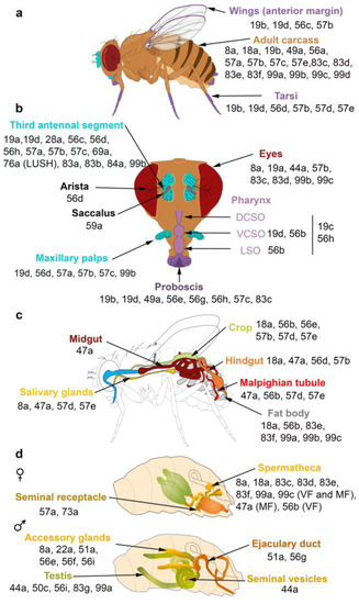 OBPs expressed in the olfactory, gustatory, digestive and reproductive organs of D. melanogaster. (a,b) Adult taste organs (purple) consist of the proboscis, the internal structure in the pharynx (the labral sense organ (LSO), the ventral and dorsal cibarial sense organs (VCSO and DCSO)), the leg tarsi, the anterior margin of the wings and the female genitalia. Adult olfactory organs (turquoise) consist of the antenna and the maxillary palps. OBPs expressed in each organ are indicated by their number. OBPs are found in chemosensory and non-chemosensory organs. (c) Expression patterns of OBPs in the adult digestive tract. (d) Expression patterns of OBPs in the female and male reproductive organs. The expression of OBPs in female spermatheca depends on the sexual state. Some OBPs are expressed in virgin female (VF) and mated female (MF) spermatheca, while the expression of some OBPs is mating-dependent [36,37,38,47,54,55,56,57,58,59].