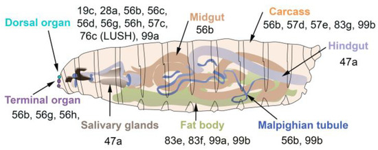 In D. melanogaster, some OBPs are expressed in both larva and adults, while others are only expressed in adults (Figure 3). The majority of OBPs expressed in larva show similar expression patterns in adult tissues (Figure 2 and Figure 3).