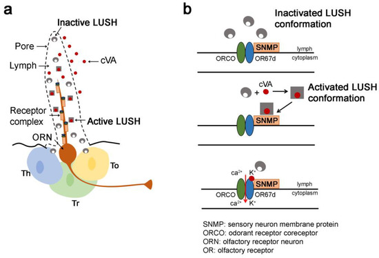 Model of the mechanism of the conformational activation of LUSH leading to cis-Vaccenyl Acetate (cVA) pheromone detection. (a) Schematic drawing of at1 cVA-sensing trichoid sensillum. This sensillum is punctured by multiple pores and houses one olfactory receptor neuron (ORN). The heteromeric complex composed of the OR67d pheromone receptor/ORCO coreceptor and the CD36-related sensory neuron membrane protein (SNMP) is localized on the ORN dendrite. Three accessory cells, trichogen (Tr), thecogen (Th) and tormogen (To) cells, surround the cell body of the ORN. Thecogen and the tormogen cells both secrete sensillar lymph components, including OBPs. (b) Top: in the absence of the cVA pheromone, LUSH is in an inactive state, and when bound to cVA, LUSH undergoes a conformational change. Middle and bottom: subsequently, direct or indirect interaction of “cVA/LUSH” with SNMP1 induces the release and transfer of cVA to the ligand-binding site within the OR67d/ORCO complex. Adapted from [121,122].
