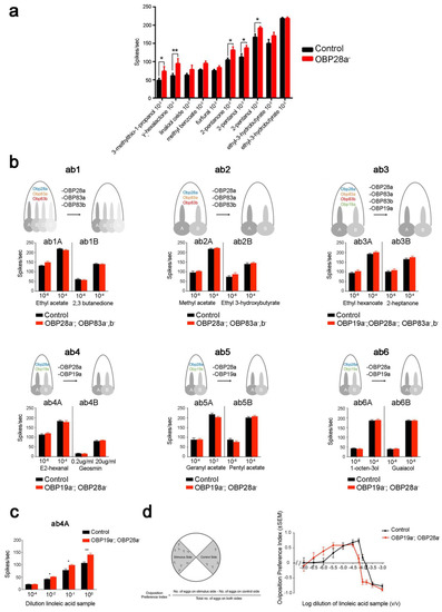 Recent studies have highlighted the involvement of OBPs in the sensitivity of flies to odorants and sex pheromones. In Drosophila, deletion of OBP28a in the ab8 sensillum (OBP28a is the only OBP expressed in these sensilla) induced increased electrophysiological responses in different odorants tested over a broad concentration range. These data suggest that OBP28a acts as a buffer against sudden changes in odorant levels, which means that, after a sudden influx of odorant into the sensillum, OBP28a binds some of the odorant molecules to reduce the amount remaining available to activate ORs [34] (Figure 7a). However, the deletion of the abundant OBPs expressed in other basiconic sensilla (with the exception of ab4) did not affect their electrophysiological responses towards a wide variety of olfactory stimuli [146] (Figure 7b). The ab4 sensillum mutation elicited a stronger electrophysiological response and a lower threshold in oviposition preference towards linoleic acid compared to control flies [146] (Figure 7c). This finding indicates that OBPs also have a modulating effect on the olfactory physiology and on behaviour towards specific odorants.