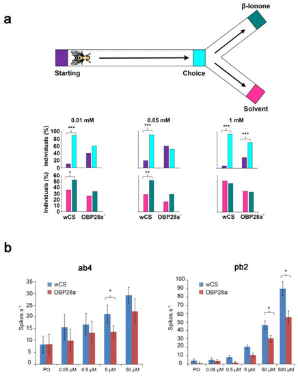 Further investigation of OBP28a implicated its role in the detection of the floral odorant β-ionone [94]. Y-olfactometer assays revealed that the locomotion and the choice responses of OBP28a mutant flies were only altered at certain β-ionone concentrations. More precisely, control flies showed both higher locomotion to the choice point and a higher preference for the olfactometer arm containing 0.01 and 0.05 mM β-ionone compared to mutant flies. However, the responses of control and mutant flies to 1 mM β-ionone were not different (Figure 8a), indicating that mutant flies have decreased sensitivity to lower concentrations of β-ionone. Moreover, the ab4 and pb2 sensilla of mutant flies showed decreased electrophysiological responses to the highest β-ionone concentrations tested when compared to control flies (Figure 8b). These results indicate that the OBP28a deletion induced an increased threshold of the β-ionone detection [94]. The enhanced sensitivity role of OBP discovered in flies was supported with a Bombyx mori study. More precisely, BmPBP1-knockout males showed a reduced electrophysiological antennal response to bombykol (female sex pheromone) than wild-type males. The initiation of the orientation behaviour to the pheromonal source was also reduced in BmPBP1-knockout males [19].