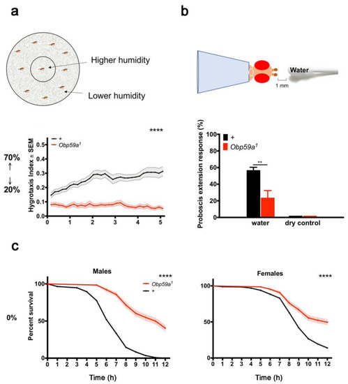 OBPs are also involved in hygro-reception [57]. The genetic suppression of OBP59a expressed in the second chamber of the antennal sacculus (Figure 2b) affects Drosophila hygrotaxis. The preference of flies presented to a binary choice of high or low humidity was measured over different time scales. While control flies chose the humid sector, OBP59a-deficient mutant flies preferred the drier sector. This experiment indicates that OBP59a is involved in humidity perception (Figure 9a). Mutant flies also showed a reduced proboscis extension response (PER) to water vapor and, more unexpectedly, higher resistance to desiccation than control flies (Figure 9b) [57]. The molecular pathway of humidity detection by OBP59a is still unknown.