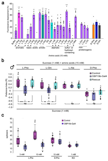 OBP19b was recently identified as a major factor involved in the detection of specific amino acids. Ligand binding assays revealed that OBP19b binds a subset of L-amino acids (Figure 11a). Drosophila mutants devoid of OBP19b showed an altered preference to these L-amino acids (L-phenylalanine and L-glutamine) compared to control flies (Figure 11b). Mutant flies also showed decreased electrophysiological responses of single-taste proboscis sensilla towards the same amino acids (Figure 11c). Given that the OBP19b-like protein coding sequence is highly conserved in various dipteran insects, it might play a critical role in the detection of amino acid-rich food [37]. Future studies should aim to better decipher the link between the peripheral and central nervous systems involved in amino acid perception [153]. Indeed, the Drosophila protein appetite is regulated by two central system regions: (i) a small cluster of dopaminergic neurons enhancing yeast intake in protein-deprived flies [154] and (ii) the protein-specific satiety hormone FIT, which inhibits protein-rich food intake [155]. In addition, study of the ability of the OBP19b three-dimensional structure to bind amino acids will help to solve the OBP–amino-acid interaction at the biochemical level.
