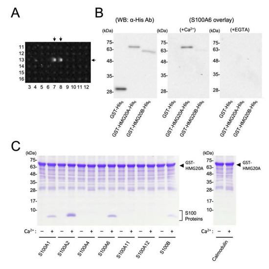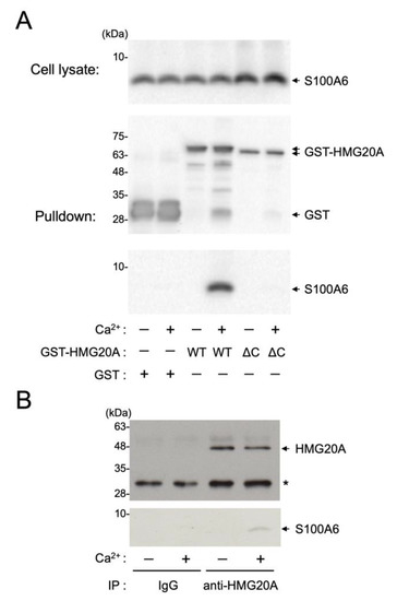During screening of protein-protein interactions, using human protein arrays carrying 19,676 recombinant glutathione s-transferase (GST)-fused human proteins, we identified the high-mobility protein group 20A (HMG20A) as a novel S100A6 binding partner. We confirmed the Ca2+-dependent interaction of HMG20A with S100A6 by the protein array method, biotinylated S100A6 overlay, and GST-pulldown assay in vitro and in transfected COS-7 cells. Co-immunoprecipitation of S100A6 with HMG20A from HeLa cells in a Ca2+-dependent manner revealed the physiological relevance of the S100A6/HMG20A interaction. In addition, HMG20A has the ability to interact with S100A1, S100A2, and S100B in a Ca2+-dependent manner, but not with S100A4, A11, A12, and calmodulin. S100A6 binding experiments using various HMG20A mutants revealed that Ca2+/S100A6 interacts with the C-terminal region (residues 311–342) of HMG20A with stoichiometric binding (HMG20A:S100A6 dimer = 1:1). This was confirmed by the fact that a GST-HMG20A mutant lacking the S100A6 binding region (residues 311–347, HMG20A-ΔC) failed to interact with endogenous S100A6 in transfected COS-7 cells, unlike wild-type HMG20A. Taken together, these results identify, for the first time, HMG20A as a target of Ca2+/S100 proteins, and may suggest a novel linkage between Ca2+/S100 protein signaling and HMG20A function, including in the regulation of neural differentiation.