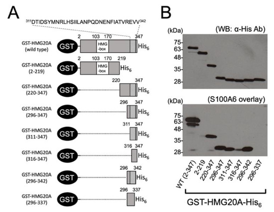 Mapping of the S100A6 binding region in HMG20A. (A) Schematic representation of GST-HMG20A-His6 proteins, including the wild type (residues 2–347) and various truncation mutants. S100A6 binding sequence (residues 311–342) is indicated. HMG-box, high mobility group-box. (B) Extracts of E. coli expressing GST-HMG20A-His6 proteins as shown in panel A were subjected to immunoblot analysis using anti-His-tag antibody (upper panel) and S100A6 overlay analysis (lower panel).