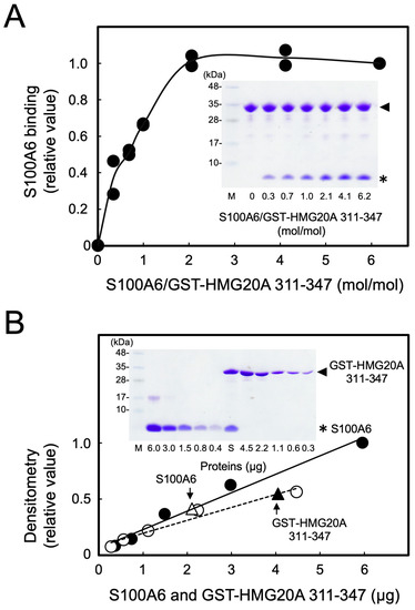 To examine the binding stoichiometry of S100A6 with HMG20A, a GST-pulldown assay using GST-HMG20A 311–347, which was shown to bind S100A6 (Figure 2B), was performed with various concentrations of S100A6 (Figure 3A). S100A6 binding to GST-HMG20A 311–347 increased with the addition of an increasing concentration of S100A6, which was saturated at a 1:2 molar ratio (GST-HMG20A:S100A6 monomer). We next attempted to quantify S100A6 and GST-HMG20A 311–347 in the GST-pulldown sample at a 1:4.1 molar ratio, as shown in Figure 3A, based on the densitometric scanning with standard proteins (Figure 3B). In an aliquot of the GST-pulldown sample, 4.1 µg of GST-HMG20A 311–347 and 2.1 µg of S100A6 were calculated to be contained, indicating that the molar ratio of GST-HMG20A 311–347 to the bound S100A6 monomer was 1 to 1.65. Taken together (Figure 3A,B), the S100A6 dimer binds to the HMG20A monomer stoichiometrically at the C-terminal region (residues 311 to 347).