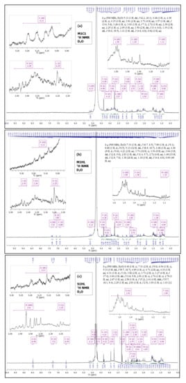 To confirm the data obtained with IR and GC, the samples were submitted to the analysis of 1H protons in NMR. Figure 1 presents 1H spectra of the biosurfactants produced by Trichoderma strain (C1 and HL) on the MGP M1 (Figure 1a,b) and the Saunders’ S1 (Figure 1c) substrates, respectively. A number of peaks is observed in NMR due to the presence of proteins and aliphatic fatty acids chains. Hence, a lipopeptide structure of the produced biosurfactant was confirmed. The proton NMR spectra appear complex; however, some distinguished peaks are present and their chemical shift (δ) was evaluated. Namely, for all samples, a chemical shift was recorded at: 5.25–5 ppm, corresponding to an olefinic hydrogens (H attached to =) in the fatty acid chain, 4.5–4 ppm—an aliphatic carbon-hydrogen bond, 2.2–1.8 ppm—allylic -CH2- (-CH2-C=) and at 1.1–0.8 ppm indicating –CH3.