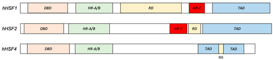 Comparison of human HSF1, HSF2, and HSF4 protein structure. All human HSF members possess a highly conserved DNA binding domain (DBD), oligomerization domain (HR-A/B), regulatory domain (RD), and the transactivation domain (TAD). In contrast to HSF1 and HSF2, HSF4 lacks the oligomerization repressor domain (HR-C).
