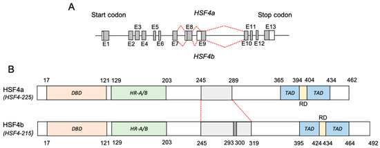 The human HSF4 gene was first isolated and characterized via cDNA library screening [16]. This gene is located on the long arm of chromosome 16, Chr16q22.1. The expression of HSF4 is generally ubiquitous across different tissue types; nonetheless, high expression of HSF4 is detected mainly in muscle tissues and also the cerebral cortex, midbrain, retina, and pancreas [30]. According to the Ensembl database (human assembly GRCh38.p13), the HSF4 gene can be transcribed into 25 different transcripts, albeit only eight transcripts are annotated as protein-coding [31] (Table 1). Comprised of 13 exons, the HSF4-215 and HSF4-225 are the two primary HSF4 isoforms, which are also annotated as HSF4b and HSF4a, respectively. These isoforms arise due to the alternative splicing that occurs at HSF4 exon eight and exon nine [32] (Figure 3a,b). HSF4b is the predominant HSF4 isoform (hereinafter referred to as HSF4 unless stated otherwise) that encodes 492 amino acids, whereas the HSF4a isoform is 30 amino acids shorter.