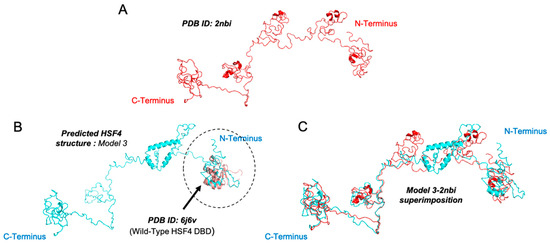 HSF4 3D-structure as predicted by I-TASSER. (A) I-TASSER predicted 2nbi as the closest HSF4 analog. The superimposition of the predicted HSF4 structure model 3 with the (B) previously resolved wild-type HSF4 DNA binding domain structure (Protein Databank (PDB) ID: 6j6v) and (C) its closest analog 2nbi.