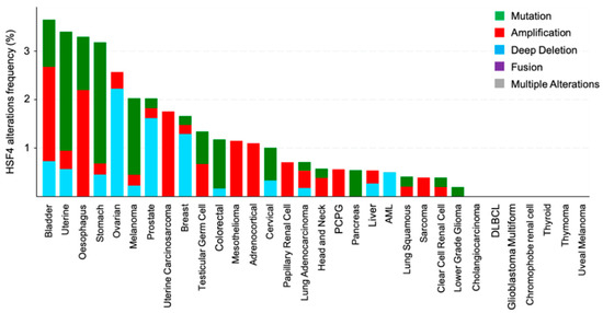 The frequency of HSF4 genetic alterations in thirty-two different cancer types characterized in the large scale Cancer Genome Atlas project. The identified genetic alterations in HSF4 include mutation, amplification, deep deletion, and fusion. These HSF4 genetic alterations frequency data were queried and extracted using cBioPortal (https://www.cbioportal.org/, accessed on 9 January 2021).