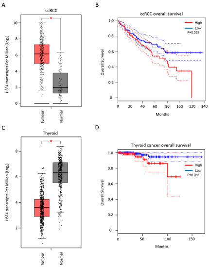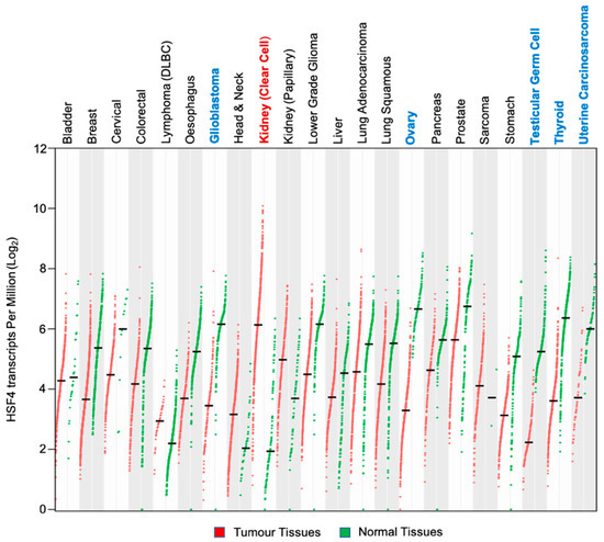 Dot plots representing the HSF4 expression RNA-Seq data in tumor and normal tissue samples from The Cancer Genome Atlas (TCGA) and The Genotype-Tissue Expression (GTEx) databases, respectively. HSF4 was found to be significantly upregulated in clear cell renal cell carcinoma (ccRCC) and significantly downregulated in glioblastoma, ovarian cancer, testicular germ cell cancer, thyroid cancer and uterine carcinosarcoma (Log2FC|2|; p-value < 0.05). The data were analyzed and visualized using the GEPIA2 (Gene Expression Profiling Interactive Analysis) web application (http://gepia.cancer-pku.cn, accessed on 9 January 2021).