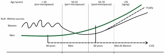 When viewed in this way, and as epidemiologic facts indicate, NLR values may be lower in women in the time around menopause, and in early post-menopause, when compared to both, premenopausal women and age-matched men, which makes this parameter unsuitable as a marker of increased CV risk in women. Distinctly from women, a gradual increase in NLR, in middle-aged men (40–60 years old), is likely to reflect the progression of subclinical atherosclerosis, and can therefore be used in CV risk stratification (Figure 2).