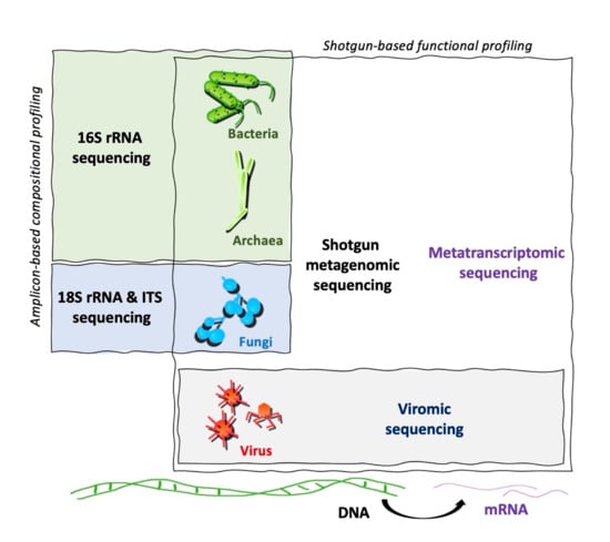 Viruses are key constituents of microbial communities which contribute to their evolution and homeostasis. Viromic sequencing has been used to study the intestinal viruses in different diseases, including type 1 diabetes [8], inflammatory bowel disease [10,125], alcohol-associated liver disease [126], non-alcoholic fatty liver disease [127], colorectal cancer [128,129], human immunodeficiency virus [130], and autoimmune diseases [11]. Because of the highly diverse nature of viruses and the lack of universal marker genes, it is difficult to use amplicon-based approach to amplify them with universal markers. Instead, shotgun metagenomic sequencing approaches can be used to characterize viruses and identify novel viruses.
