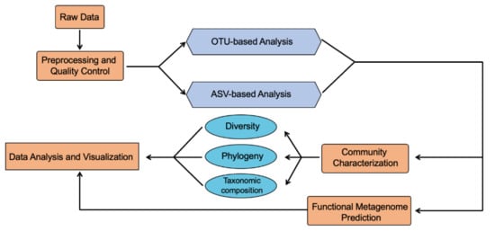 16S ribosomal RNA subunit gene contains both regions that are conserved throughout bacterial species and hypervariable regions that are unique for specific genera. 16S rRNA sequencing has been widely used to characterize the bacterial community, which utilizes PCR to target and amplify portions of the hypervariable regions (V1–V9) of the bacterial 16S ribosomal RNA subunit gene. Various bioinformatics tools have been developed in the last decade to analyze the 16S rRNA sequencing data, with most of them containing three core steps, including data preprocessing and quality control, taxonomic assignment, and community characterization (Figure 2). Quality control is the first step in the analysis pipeline, which includes quality checking, adapter removal, filtering and trimming to remove artifacts, low-quality and contaminant sequencing reads resulting from sample impurities or inadequate samples preparation steps [16]. Many quality control software packages use PHRED algorithm score to assess the base quality [17].
