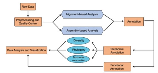 The process of shotgun metagenomic sequencing can be summarized as following: sample collection and storage, nucleic acid extraction, metagenomic library preparation, quality control, and data analysis. Quality control is the first step in the shotgun metagenomic analysis pipeline (Figure 3), which involves different tools such as Trimmomatic [89], Ktrim [90], Cutadapt [91], MultiQC [92]. The resulting high-quality reads can be either mapped to reference genomes or assembled with assembly tools. Thus, shotgun metagenomic sequencing analysis generally can be categorized into two approaches: alignment-based approach and assembly-based approach. It is often recommended to use both approaches in combination to get the most accurate results [93,94].