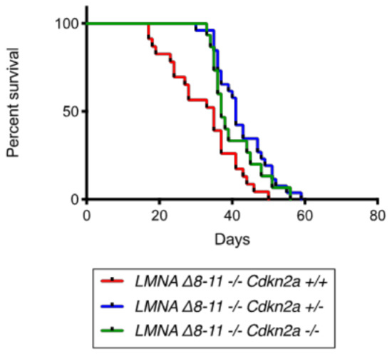 Survival curves of LMNA Δ8–11 −/− mice with different Cdkn2a backgrounds. Survival curves of the LMNA Δ8–11 −/− Cdkn2a +/+ (red), LMNA Δ8–11 −/− Cdkn2a +/− (blue) and LMNA Δ8–11 −/− Cdkn2a −/− (green). n = 15–26. Statistical tests were performed by the Gehan–Breslow–Wilcoxon test. p-values: LMNA Δ8–11 −/− Cdkn2a +/+ vs. LMNA Δ8–11 −/− Cdkn2a +/−; LMNA Δ8–11 −/− Cdkn2a +/+ vs. LMNA Δ8–11 −/− Cdkn2a −/−.
