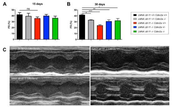 Echocardiographic results of LMNA Δ8–11 −/− mice with different Cdkn2a backgrounds. (A) Fractional shortening measures obtained at 15 days. n = 3–6. (B) Fractional shortening measures obtained at 1 month. n = 3–5. (C) Representative images of indicated genotypes of M-mode acquisitions in 1-month-old mice. Error bars represent ± Stanbdard Error of the Mean (SEM). Statistical tests were performed with one-way ANOVA with multiple comparisons. * p < 0.05; ** p < 0.01; *** p < 0.001. ns, not significant.
