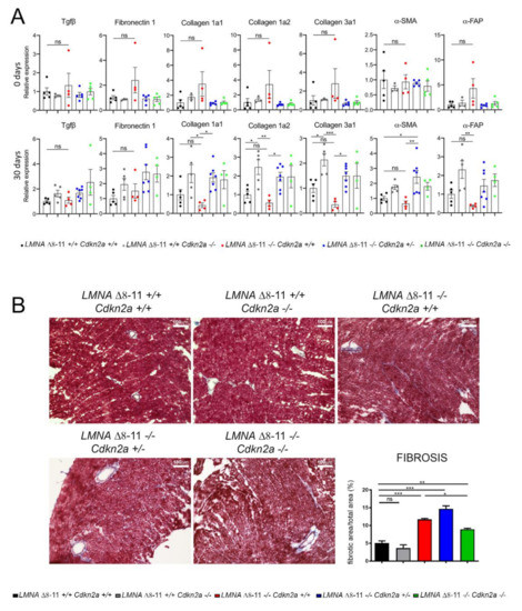 Murine hearts were collected post mortem at Day 0 (P0) and Day 30 (P30) after birth. Total RNA was extracted from the whole heart using Tissue Ruptor (Qiagen, 9002755, Germantown, MD, USA) and TriReagent (Sigma, T9424, St. Louis, MO, USA) following the standard procedure: 1 µg of RNA from each sample was retrotranscribed into cDNA using the QuantiTect reverse transcription kit (Qiagen, 205313, Germantown, MD, USA) and amplified in the presence of 5 µL of SYBR select master mix (Thermo Fisher, 4472908, Waltham, MA, USA) using the Quant Studio 5 Real-Time PCR System (Thermo Scientific, A28140, Waltham, MA, USA). All the reactions were performed in a final volume of 10 µL and with a technical triplicate. Expression was calculated by normalizing Threshold Cycle (Ct) values on Glyceraldehyde 3-phosphate dehydrogenase (GAPDH) and relative to the average of the wild type (LMNA Δ8–11 +/+ Cdkn2a +/+) control samples. The primer sequences used for transcriptional analyses were the following: GAPDH: 5′-GTATGTCGTGGAGTCTACTGG-3′, 5′-TCGTGGTTCACACCCATCAC-3′; TGFβ: 5′-CAACCCAGGTCCTTCCTAAA-3′, 5′-GGAGAGCCCTGGATACCAAC-3′; Collagen 1a1: 5′-CCTCAGGGTATTGCTGGACA-3′, 5′-GAAGGACCTTGTTTGCCAGG-3′; Collagen 1a2: 5′-GGAACAAATGGGCTCACTGG-3′, 5′-CAAGTCCTCTGGCACCTGTA-3′; Collagen 3a1: 5′-CCCAACCCAGAGATCCCATT-3′, 5′-GGTCACCATTTCTCCCAGGA-3′; Fibronectin1: 5′-CCCCATTCCAGGACACTTCT-3′, 5′-AGGGTTCTTCATCAGTGCCA-3′; αSMA: 5′-CCTCTGGACGTACAACTGGT-3′, 5′-GGTAGTCGGTGAGATCTCGG-3′; αFAP: 5′-CACCTGATCGGCAATTTGTG-3′, 5′-CCCATTCTGAAGGTCGTAGATGT-3′; Connexin43: 5′-CAATTCCTCCTGCCGCAAT-3′, 5′-GCCCCATTCGATTTTGCTCT-3′.