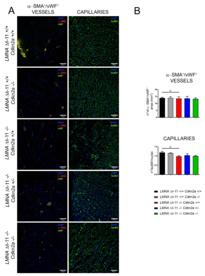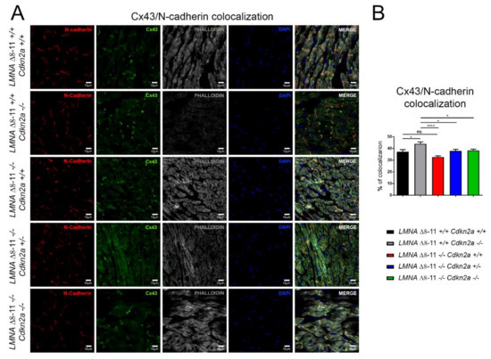 To further analyze the molecular pathways altered in LMNA Δ8–11 −/− mice and possibly recovered in the absence of Cdkn2a, we performed immunofluorescence staining. We first examined the number of α-SMA- (smooth muscle actin-) and vWF- (von Willebrand factor-) positive vessels and the capillary density, generally involved in the amount of oxygen and nutrients that support the repair process of the damaged tissue. We did not find significant differences between wt and LMNA Δ8–11 −/− mice (Figure 5A,B), even though we detected a slight decrease in capillary density in the dystrophic LMNA Δ8–11 −/− mice. These data corroborate previous reports showing that EDMD dystrophy is not accompanied by tissue degeneration [73]. Delocalization of CX43, with consequent alteration of heart contractile function, was observed in cardiomyopathies of multiple origin [74,75]. Thus, we decided to monitor the distribution of Connexin43 (CX43) on the fibers. In healthy hearts, this protein preferentially localizes at intercalated discs between adjacent cardiomyocytes, where it constitutes the gap junctions, essential for the propagation of action potentials and maintenance of the correct heartbeat [76]. Together with gap junctions, intercalated discs also host adheren junctions, enabling force transmission across the sarcolemma, which are easily recognizable by their principal protein component N-cadherin [77]. Although we did not find significant transcriptional differences in the CX43 gene across distinct genotypes (Figure S3A), we observed a general increase in CX43 staining in the LMNA Δ8–11 −/− mice (Figure S3B), suggesting an alteration of post-transcriptional or post-translational regulation of protein levels in the absence of Lamin A. Furthermore, we observed a slight decrease in the proportion of CX43 localizing at N-cadherin-positive intercalated discs in LMNA Δ8–11 −/− mice, which was partially recovered upon ablation of the Cdkn2a locus (Figure 6A,B).