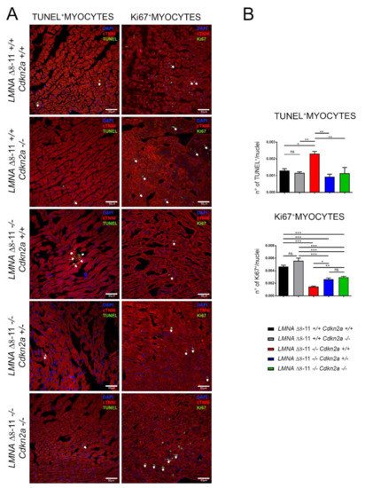 Finally, we quantified the apoptotic rate of cardiomyocytes by assessing the presence of fragmented DNA with a TUNEL assay. All LMNA Δ8–11 −/− Cdkn2a +/+ mice showed a significantly higher apoptotic index compared with healthy littermates, confirming a premature and aberrant blockage in the cell cycle (Figure 7A,B). The absence of one or two alleles of Cdkn2a is sufficient to significantly reduce the number of apoptotic cardiomyocytes (Figure 7A,B). These results were further confirmed by staining with Ki67, a marker of active proliferation. In fact, the quantification of Ki67 staining showed a substantial decrease in cardiomyocyte proliferation in dystrophic LMNA Δ8–11 −/− hearts and recovery in the Cdkn2a KO background (Figure 7A,B). Importantly, LMNA Δ8–11+/+ Cdkn2a −/− mice did not exhibit an increase in cell proliferation, suggesting that in a non-dystrophic condition, the lack of Cdkn2a function does not necessarily activate cell proliferation. Taken together, these results reveal that Cdkn2a plays an essential role in the regulation of cardiomyocyte fitness in the heart, and its ablation in LMNA Δ8–11 −/− dystrophic mice is enough to restore the physiological number of cardiomyocytes.