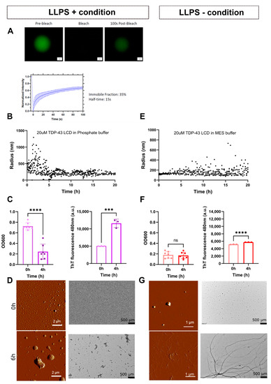 Characterization of the TDP-43 LCD behavior in phosphate buffer (LLPS+) and in MES buffer (LLPS-). (A) Fluorescence recovery after photobleaching (FRAP) of labeled TDP-43 LCD (20 µM) showing droplet recovery in the LLPS+ condition (50 mM phosphate buffer, pH 7.5) for three individual experiments. FRAP was not possible for the LLPS- condition (20 mM MES buffer, pH 5.5) as there were no droplets present. Examples of the droplets at different time points are shown on top of the panel. Scale bar = 1 µm. (B) Average of triplicate dynamic light scattering (DLS) data showing radius of protein within a 20 h time frame. Maximum size of droplets in LLPS+ buffer was 1.3 µm. (C) Turbidity (OD600) and fluorescence (ThT) values at time 0 h and 4 h. Statistical differences determined with an unpaired Student’s t-test with n = 3 for ThT graphs to look at aggregation and n = 7 for OD600 to look at LLPS absorbance at time 0. Data are presented as mean ± SD, **** p < 0.0001, *** p < 0.001. (D) Atomic force microscopy (AFM) and electron microscopy (EM) of TDP-43 LCD at 0 h and 6 h. (E) DLS data of TDP-43 LCD in MES buffer without LLPS. (F) Turbidity and absorbance of TDP-43 LCD in MES buffer at 0 h and at 4 h. Statistical differences determined with an unpaired Student’s t-test; **** p < 0.0001. ThT n = 3 and OD600 n = 7, mean ± SD is shown. (G) Atomic force microscopy and electron microscopy of TDP-43 LCD at 0 h and 6 h. Scale bar length is indicated on each photo.