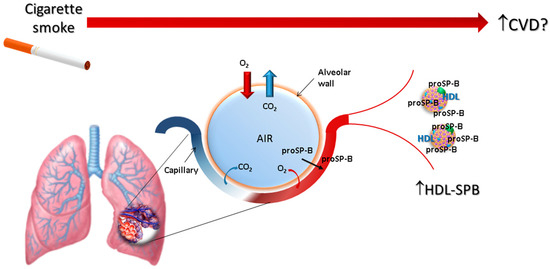 The primary entry pathway of cigarette smoke are clearly the lungs, and mainly the alveolar-capillary membrane, which has a relevant surface area and is the barrier between air and circulation. Indeed, tobacco smoke exposure induces alveolar inflammation, which results in an unphysiological release into the bloodstream instead of the alveolar space of surfactant protein B (SP-B), a protein vital for normal lung function [6,7]. Previous observations linked plasmatic SP-B, measured by assays that do not discriminate between immature or mature proteoforms, to the smoking status. Robin et al. [7] found for the first time that serum SP-B was strongly correlated with tobacco smoke exposure in subjects over 50 years old with a high index of cumulative smoking. Moreover, higher levels of circulating SP-B independently associate with aortic atherosclerosis and correlate with a dose–response effect with smoking habit in a population of 30–65 aged subjects with traditional cardiovascular risk factors beyond smoking, suggesting that SP-B may be a useful marker of the dose-dependent vascular effects of smoking [8]. Further, circulating immature proteoform of surfactant protein B (proSP-B) has been proposed as the most reliable lung-specific circulating marker for alveolar-capillary membrane dysfunction and overall clinical status of heart failure (HF) [9]. We have previously demonstrated that circulating proSP-B might rise to the role of theranostic biomarker due to its capability of functioning as a diagnostic and therapeutic biomarker [6,9,10]. We also showed that circulating proSP-B is not present in a free form, but it mainly binds to isolated HDL, and it impairs the anti-oxidant properties of HDL [11], shedding light on proSP-B as a molecule that contributes to the reduction of the defense against oxidative stress, a key mediator in the pathogenesis of HF [12].