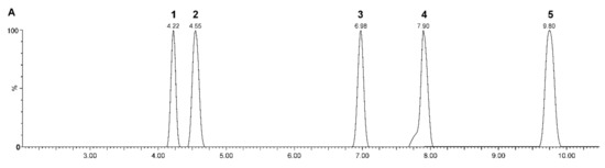 Reversed-phase chromatographic separation (Kinetex Biphenyl column, 2.1 × 100 mm; 1.7 μm) of selected neuroactive steroids by ultra-high-performance liquid chromatography–tandem mass spectrometry (UHPLC–MS/MS). Figure 3 shows the merged chromatograms for the steroid standards mixture: 1—dehydroepiandrosterone, 2—testosterone, 3—pregnenolone, 4—allopregnanolone, and 5—progesterone. Retention times (min) are indicated above the peak.