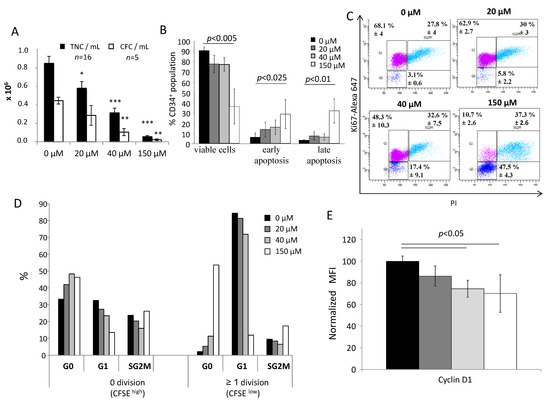 Influence of αTOA on proliferative kinetics and the cell cycle of CD34+ and committed progenitor cells. (A) αTOA inhibits the amplification of total nucleated cells (TNC) and committed progenitors (CFC) after 3 days of primary culture. *: p < 0.025, **: p < 0.01 and ***: p < 0.001 in comparison to the 0 µM condition. (B) Cell viability of CD34+ cells after 3 days of primary culture, n = 6. (C) Cell cycle labelling shows an accumulation of CD34+ cells in the G0 phase after 3 days of αTOA treatment, n = 6. (D) The G0 accumulation increases with αTOA concentration. n = 2. (E) αTOA inhibits cyclin D1 after 3 days of culture n = 5. Data presented in (A,B,C,E) are means +/− SD.