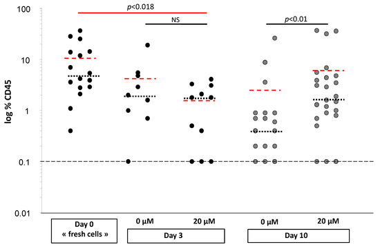 αTOA preserves a fraction of the primitive repopulating cells in culture, n = 3. Results were acquired in 3 independent experiments from 3 different CB units. The mice were injected with the cells on day 0 (1000 cells) and day 3 of primary culture with a cell dose representing the progeny of 1000 day 0 cells (black points: ~3 to 4 × 103 cells at day 3). On day 10 of the secondary culture, a 1/10 equivalent number of day 0 cells (i.e., day 3 progeny of 1000 day 0 cells) was injected (grey points: ~64 to 82 × 103 cells). In these experiments, a dose of 20 µM αTOA was applied, which was confirmed to be physiologically relevant and active. The Mann–Whitney test (black lines) showed significant results for day 10 of the secondary culture. The Kruskal–Wallis test (red line) for multiple comparisons, followed by the Mann–Whitney test with Bonferroni correction, showed significant results for day 3 with 20 µM αTOA compared to day 0. Means are represented in black dotted lines and medians in red dotted lines.