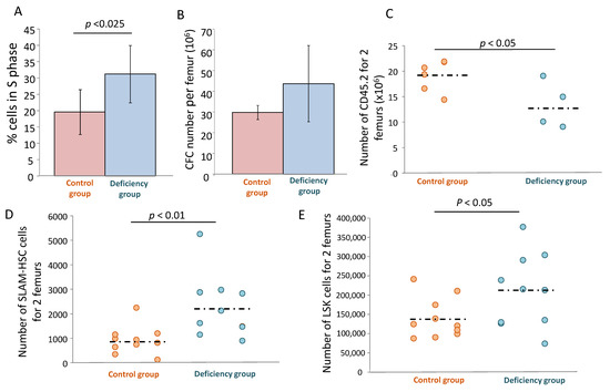 Two months after inducing αTOC deficiency (following the protocol shown in Supplementary Materials S3) by the specific alimentary diet (Supplementary Materials S4), the S phase fraction of the bone marrow committed progenitors (CFU-Mix (Colony-Forming Units uf Mixed lineages), BFU-E (Burst-Forming Unit-Erythroid), CFU-GM (Colony-Forming Unit-Granulocyte Macrophage) was increased in comparison to the control mice (Figure 7A), which suggests that αTOC acts to limit the excessive cycling of these cells in physiological conditions. In addition, there is a trend of a higher amplification rate of the CFC pool in mice with αTOA deficiency (Figure 7B). The functional exploration of hematopoietic stem cells that are able to reconstitute hematopoiesis in vivo (Figure 7C) showed that αTOC deficiency actually decreased the number of HSC exhibiting a functional capacity. In spite of this fact, in terms of phenotypic populations known to be enriched in hematopoietic stem cells and primitive progenitors (respectively called SLAM (Lin− CD48− CD150+) and LSK (Lin− Sca1+ CD117+) populations), αTOC deficiency resulted in their expansion (Figure 7D,E) and the consequent enhancement of the CFC compartment.