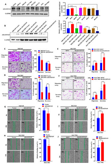 Figure 2. ADAMTS19 suppresses GC cell migration and invasion in vitro. (A) ADAMTS19 protein expression levels measured in seven gastric cancer cell lines (MKN1, MKN45, SGC7901, AGS, BGC823, HGC27, and MGC803) and one normal gastric epithelial cell line (GES1) by Western blotting. (B) MGC803 and MKN45 cells with low expression of endogenous ADAMTS19 were chosen to construct stably-overexpressed ADAMTS19 cells transfected with a lentiviral vector, and BGC823 and SGC7901 cell lines with high endogenous ADAMTS19 were stably transfected with shRNA through a lentiviral vector. ADAMTS19 expression in stably transfected cells was confirmed by Western blotting. (CF) Overexpression of ADAMTS19 suppressed GC cell migration and invasion, while ADAMTS19 knockdown reversed the effects. (GJ) Wound healing assays showed that overexpression of ADAMTS19 significantly inhibited wound healing in MKN45 and MGC803, whereas ADAMTS19 knockdown promoted wound healing in BGC823 and SGC7901. The data are presented as means ± standard deviations. * p < 0.05; ** p < 0.01; *** p < 0.001.