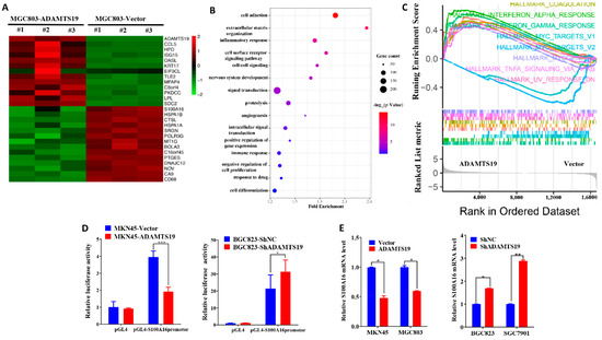 Whole-transcript deep sequencing (RNAseq) was performed on a BGISEQ-500 platform (BGI, Shenzhen, China). The analysis was designed with two groups of paired MGC803-Vector/ADAMTS19 cells. Heat map analysis of the altered genes was performed using OmicShare Heatmap tools (http://www.omicshare.com/tools, access date: 3 July 2020). The data were also analyzed using the Gene Ontology (GO) method with the free online analysis tool, Database for Annotation, Visualization and Integrated Discovery (DAVID; https://david.ncifcrf.gov/, access date: 3 July 2020) [19,20]. The results of the GO analysis were displayed using the online analysis tool, SangerBox (http://sangerbox.com/Index, access date: 23 December 2020). Gene set enrichment analysis (GSEA) was performed using a GSEA preranked tool, R (version 4.0.3, The R Foundation, New York, NY, USA), and RStudio (1.4.1103, RStudio, Boston, MA, USA).