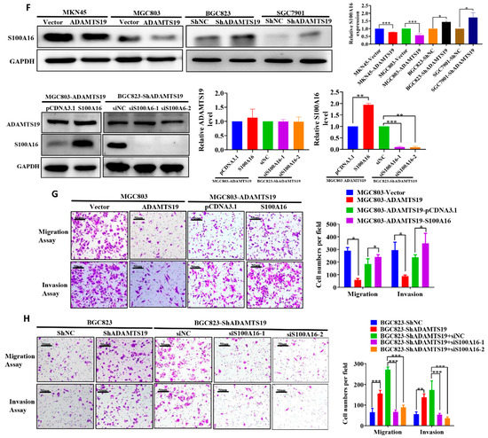 Figure 3. S100A16 is a downstream of ADAMTS19 and acts as a tumor promoter, promoting cell migration and invasion. (A) Heat map analysis showed altered genes in MGC803-ADAMTS19 and MGC803-vector cells. (B) Gene Ontology analysis showed that the altered genes are involved in biological processes, such as cell adhesion, extracellular matrix organization, inflammatory response, and cell surface receptor signaling pathway. (C) Gene set enrichment analysis (GSEA) showed the enrichment of ADAMTS19-associated genes in HALLMARK_TNF_SIGNALING VIA_NFKB and other pathways. The plot was drawn using R and RStudio. (D) Dual-luciferase gene reporter assays revealed that ADAMTS19 could regulate the S100A16 transcription directly in MKN45 and BGC823. (E,F) Quantitative RT-PCR and Western blot analysis showed that S100A16 protein levels were affected by ADAMTS19. (G,H) Ectopic expression of S100A16 reversed the inhibition of cell migration and invasion by ADAMTS19 in MGC803 and BGC823 cells. The data are presented as means ± standard deviations. * p < 0.05; ** p < 0.01; *** p < 0.001.