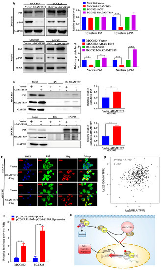 Figure 4. ADAMTS19 downregulates S100A16 by participating in the process of P65 phosphorylation of the NF-κB pathway. (A) Nucleus phospho-P65 was decreased in MGC803-ADAMTS19 and increased in BGC823-shADAMTS19 cells. (B) Co-immunoprecipitation assays revealed that ADAMTS19 interacted with P65 in MGC803. (C) Double immunofluorescence assays revealed that ADAMTS19 was co-localized with P65 in cytoplasm in MGC803 and MKN45 cells after transfection with pCDNA3.1-ADAMTS19-3xFlag, and nucleus P65 was significantly downregulated in MGC803 cells. (D) The positive correlation between S100A16 and P65 was verified using GEPIA 2. (E) Dual-luciferase reporter gene assays showed that P65 acted as a transcription factor of S100A16. (F) Brief schematic model showing that ADAMTS19 regulated S100A16 via the NF-κB pathway and participated in P65 phosphorylation. The data are presented as means ± standard deviations. * p < 0.05; ** p < 0.01; *** p < 0.001.