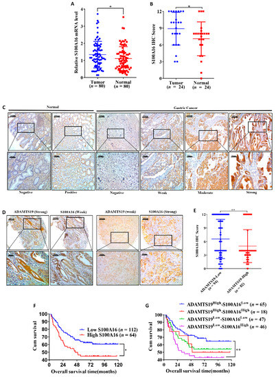 Figure 5. A combination of ADAMTS19 and S100A16 expression predicts the prognosis of GC patients. (A) Quantitative RT-PCR on 80 paired GC tissues showed that S100A16 mRNA expression was higher in tumor tissue than in adjacent normal tissue. (B) IHC analysis of 24 paired tissues showed that S100A16 expression was higher in tumor tissue than in adjacent normal tissue. (C,D) Representative IHC images of S100A16 and ADAMTS19 at the same points of tissue microarrays. (E) The negative correlation between ADAMTS19 and S100A16 was confirmed by IHC. (F) High S100A16 expression predicted poorer overall survival than low expression in GC patients (the best cutoff score of 6.0 was obtained using X-tile). (G) Survival analysis layered by the expression of ADAMTS19 and S100A16 in tissue microarrays of GC patients showed that ADAMTS19high-S100A16low patients had the best overall survival (OS), whereas ADAMTS19low-S100A16high patients had the worst OS. * p < 0.05; ** p < 0.01.