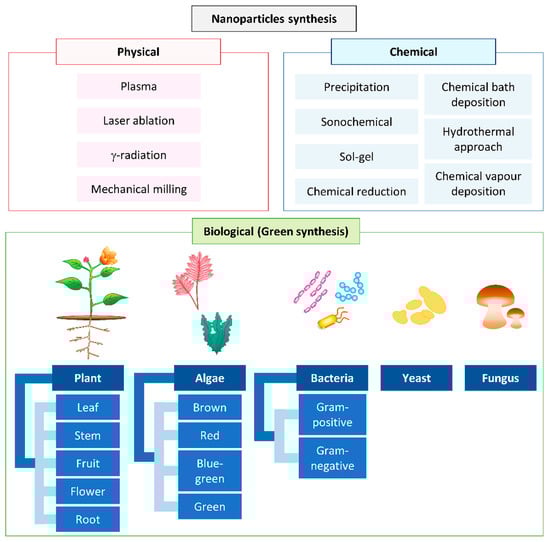 Nanoparticles (NPs) are materials ranging in size from 1–100 nm, with unique properties compared to bulk materials [1]. Their higher surface-area-to-volume ratio is a very important unique property that allows them to be used in different fields of chemical, food, electronic, and healthcare industries [2,3,4]. There are various physical, chemical, and biological approaches to synthesizing NPs (Figure 1).