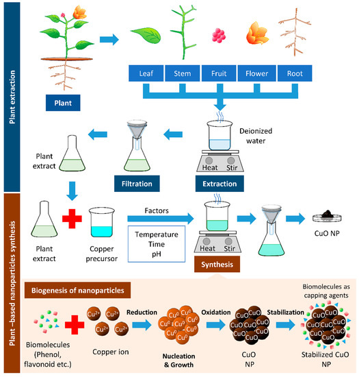 Figure 2. Plant-based synthesis of copper oxide nanoparticles. The boiling of respective parts of the plant can be used to extract biomolecules from the plant. The resulted filtrate is the plant extract, which can reduce the copper precursor to synthesize copper/copper oxide nanoparticles (Cu/CuO NPs). The biomolecules’ presence in plant extracts serves as reducing, stabilizing, and capping agents in Cu/CuO NP synthesis.