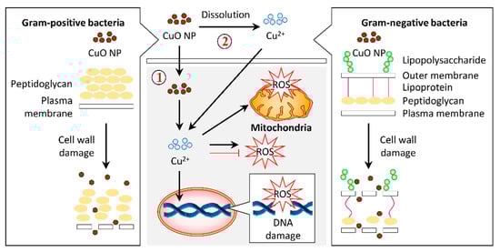 Figure 4. Graphical representation of the proposed mechanism for antibacterial activity in response to copper oxide nanoparticles (CuO NPs). (1) Gram-positive and Gram-negative bacteria have different cell wall compositions, which can be destroyed by CuO NPs. This cell wall damage results in bacteria lysis. Internalization of CuO NPs eventually releases Cu2+ ions in the cytosol, leading to reactive oxygen species (ROS) accumulation in the bacteria and, subsequently, DNA and mitochondria damage. Alternatively, CuO NPs may release Cu2+ ions and permeate into the cells to stimulate the cellular response that contributes to bactericidal activity.