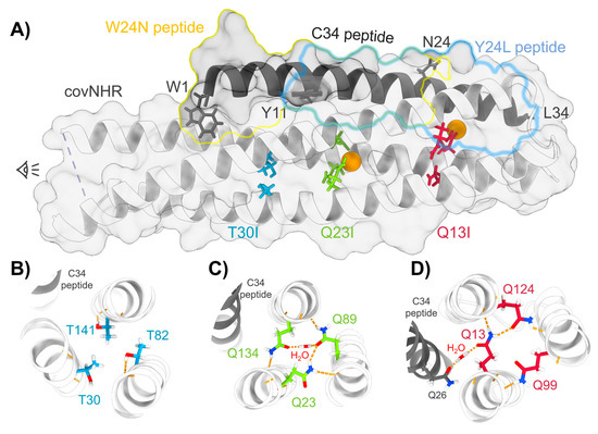 Buried polar amino acids in the coiled-coil structure of covNHR. (A) Representation of the X-ray structure of the complex of covNHR with W34L (C34) (PDB id. 6R2G) [23]. The limits of the W24N and Y24L peptides are highlighted on the structure with yellow and blue lines, respectively. The buried polar side chains are represented with sticks and buried water molecules with orange spheres. (B–D) Cross-sectional representations of each triad of polar side chains showing hydrogen bonds in dashed yellow lines.