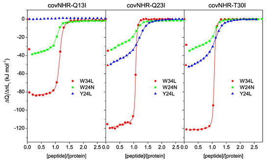 The parameters of Table 1 indicate that peptides Y24L and W24N, which only occupy two pockets on the NHR crevice, have a much lower affinity than W34L, which covers the three pockets. The core mutations generate significant decreases in the binding enthalpies compared to the parent covNHR protein but, in general, produce relatively small changes in the binding affinity for the short peptides, except in the case of the complete abolishment of binding of Y24L to covNHR-Q13I. The loss of favorable binding enthalpy is therefore compensated by a lower entropy cost of binding, as a result of the increase in hydrophobicity produced by the mutations.