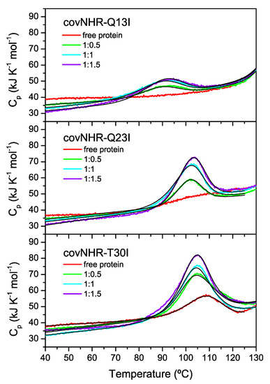 Therefore, to better estimate the binding affinities, we employed an approach based on DSC, as previously used for covNHR [23], in which we analyzed the protein–peptide mixtures at different molar ratios observing the influence of the thermally induced dissociation on the DSC thermograms. Since binding is highly exothermic, dissociation is endothermic and will be forced by heating. The resulting thermograms for the three mutants are shown in Figure 4. Interestingly, due to the extreme stability of the Q13I and Q23I mutants, the peak corresponding to peptide dissociation induced by heating becomes fully separated from the denaturation transitions of the proteins, which occur at much higher temperatures. In the case of the T30I mutant, the peaks corresponding to peptide dissociation and protein denaturation partially overlap. The curves were globally fitted with a 1:1 equilibrium binding model (N + L ↔ NL) coupled to the Lumry–Eyring denaturation model (N ↔ I → F), as described previously [23]. The binding enthalpy measured by ITC at 25 °C was fixed in the fittings. The resulting binding affinities are detailed in Table 1. Strikingly, the binding constants estimated with this procedure are considerably higher than those estimated by ITC, even up to five orders of magnitude, as it is the case of the Q23I mutant. These dramatic differences are unlikely to be due to experimental errors of the calorimetric experiments, but they likely reflect some type of anomalous binding behavior that is not accounted for by the simple binding models used to analyze the data quantitatively, as discussed later in the paper.