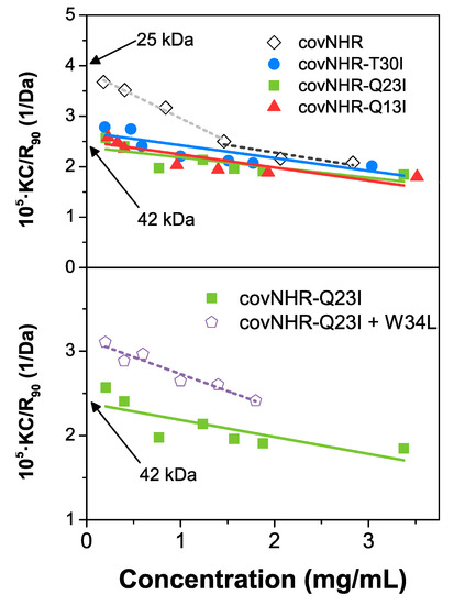 Since the core mutations increase the hydrophobicity of the mutant proteins, it is possible that they could also enhance their self-association propensity compared to the parent protein and this may have an influence on the binding to the peptides. To explore this possibility, we measured the apparent hydrodynamic radii (Rh) by DLS (Table S3). The three core mutants show Rh values slightly larger than the covNHR reference protein, which shows a value expected for a monomer. This suggests that the mutant proteins have a propensity for self-association. To confirm this hypothesis, we measured the scattering intensities as a function of the protein concentration and made the corresponding Debye plots (Figure 5). The three mutant proteins show approximately linear tendencies with intercepts in good agreement with 1/Mw of the dimer (Figure 5, upper panel). In contrast, the reference protein departs at low concentration from this tendency and shows an intercept in agreement with a monomeric state. The results confirm a significantly increased self-association as dimers of the core mutants compared to the reference protein, explaining the anomalous ITC profiles observed for the core mutants. The scattering measurements with the covNHR-Q23I mutant in complex with the W34L, at a 1:2 protein/peptide ratio, show and intercept in the Debye plot corresponding to a molecular weight of about 32 kDa, closer to the expected Mw of the complex (25 kD) than to that of the dimer (50 kDa). These results indicate a considerable reduction in molecular mass indicating that peptide binding shifts the dimerization equilibrium towards the monomeric state, in good consistency with the 1:1 binding stoichiometry observed by ITC (Figure 3). This implies that self-association perturbs peptide binding, probably by occluding or distorting the NHR binding crevice.
