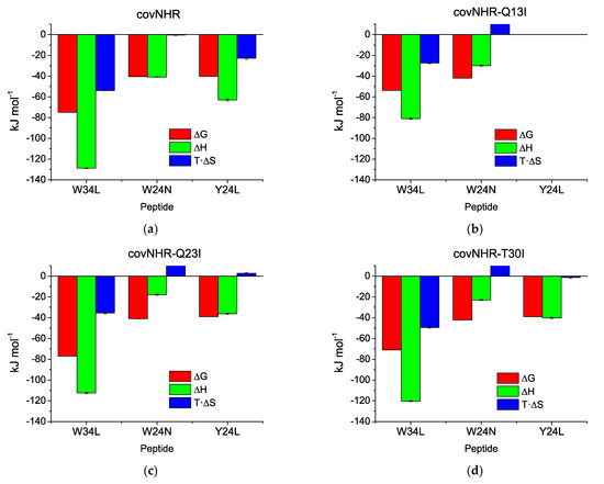 Thermodynamic signature of the binding of CHR peptides to the covNHR proteins. Enthalpy, entropy, and Gibbs energy of binding were obtained from parameters listed in Table 1. (a) Reference covNHR protein; (b) covNHR-Q13I; (c) covNHR-Q23I; (d) covNHR-T30I.