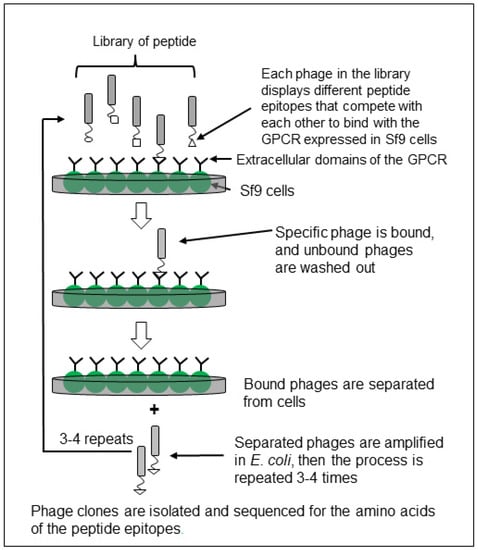 Phages bound to the GPCR were then separated, amplified into the host E. coli, and recycled through the process another three times. After the fourth round of the panning selection process, the phage DNAs from randomly chosen clones were sequenced to identify the small peptide epitopes. After the target GPCR was expressed in Sf9 insect cells, the GPCR-based screening process required less than two weeks to isolate and identify small peptides (Figure 1) [,].
