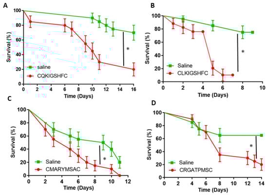 The survival of fire ant workers after injection of synthetic peptides. Saline was injected as a control. An asterisk (*) indicates significant differences by Logrank test (A) CQKIGSHFC (p = 0.0001), (B) CLKIGSHFC (p = 0.0001); (C) CMARYMSAC (p = 0.0066); (D) CRGATPMSC (p = 0.0180). Survival curves were compared using a standard Log-rank test survival analysis. Each replicate was composed of twenty ants, each treatment/control was replicated three times (mean ± 3 s.d).