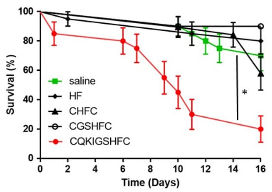 The survival of fire ant workers after injection of the most abundant peptide (CQKIGSHFC) and various short peptides modified from the original epitope. Saline was injected as a control. The asterisk (*) indicates significant differences by Logrank test (CQKIGSHFC (p = 0.0001). Survival curves were compared using a standard Log-rank test survival analysis. Each replicate was composed of twenty ants, each treatment/control was replicated three times (mean ± 3 s.d).