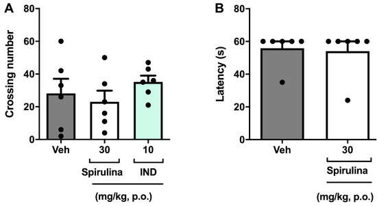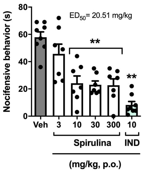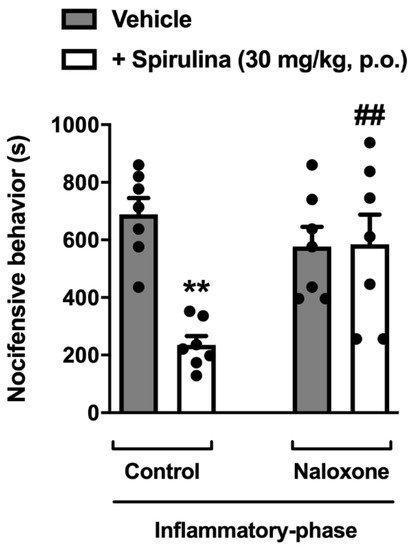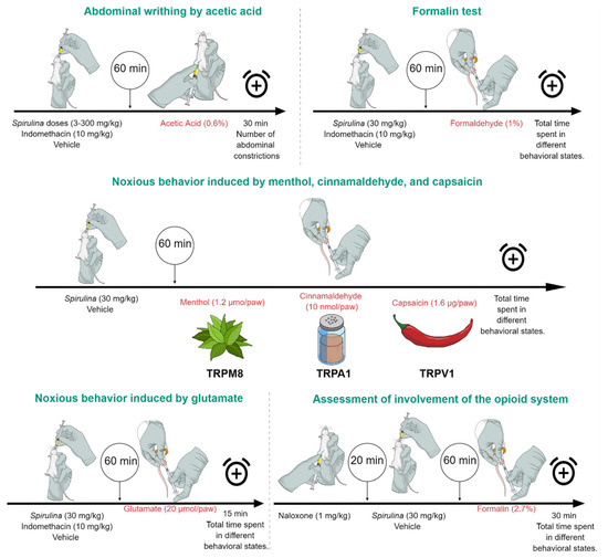 - Santos, D.S.; Lauria, P.S.S.; Evangelista, A.F.; Azeredo, F.J.; Costa, J.A.V.; Soares, M.B.P.; Druzian, J.I.; Villarreal, C.F. Beyond inflammation: centrally mediated antinociceptive properties of Spirulina platensis LEB-18 biomass via the opioid system. J. Funct. Foods 2020, 72, 104083. [Google Scholar] [CrossRef]