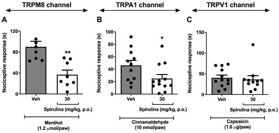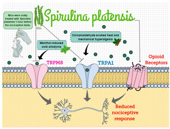 Freitas, M.A.; Vasconcelos, A.; Gonçalves, E.C.D.; Ferrarini, E.G.; Vieira, G.B.; Cicia, D.; Cola, M.; Capasso, R.; Dutra, R.C. Involvement of Opioid System and TRPM8/TRPA1 Channels in the Antinociceptive Effect of Spirulina platensis. Biomolecules 2021, 11, 592. https://doi.org/10.3390/biom11040592