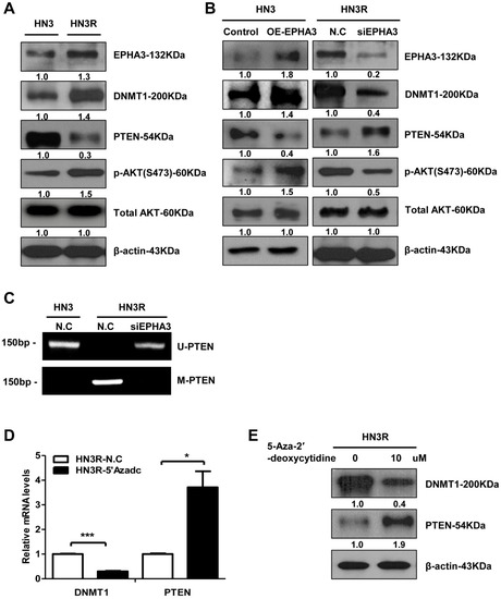 EPHA3 maintains PTEN suppression and Akt activation through DNMT-mediated DNA methylation in radioresistant head and neck cancer cells. (A) Western blotting analysis showing the expression levels of EPHA3, DNMT1(DNA methyltransferase), PTEN, pAkt, and total Akt in HN3 and HN3R cells. (B) Expression levels of EPHA3, DNMT1, PTEN, pAkt, and total Akt were assessed using western blotting in HN3 cells after transfection with EPHA3, and expression levels of EPHA3, DNMT1, PTEN, pAkt, and total Akt were assessed using western blotting in HN3R cells after the silencing of EPHA3 (C). A conventional method of testing the methylation status, the MSP assay, showed aberrant, hypermethylated DNA for PTEN in HN3 and HN3R cells. (D,E) Expression of PTEN at mRNA and protein levels after treatment with the DNA demethylating agent 5-aza-20-deoxycytidine (5-AZAdC) in HN3R cells using RT-PCR and western blotting. * p < 0.05; *** p < 0.001.